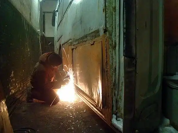 Пригнали автобус в гараж и сразу за дело...снимаем старую обшивку.
