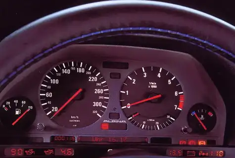 Спидометр оцифрован до 320 км/ч (у М5 он размечен до 300) и имеет логотип Alpina.На приборную доску выведены датчики давления и температуры масла. Также присутствует информация о давлении наддува, который можно регулировать с помощью неприметного приборчика, расположенного у основания центральной консоли.