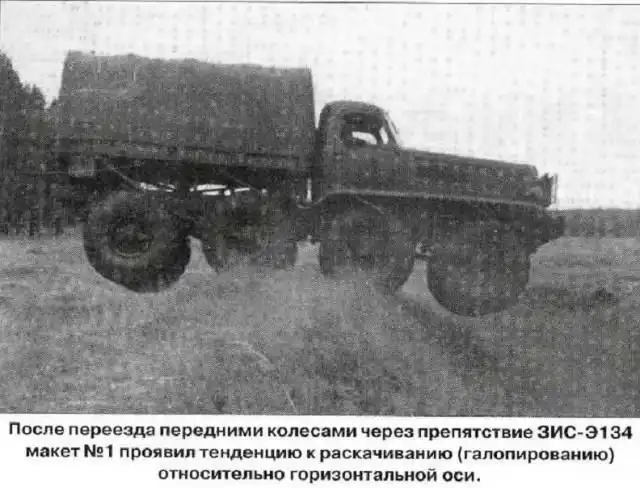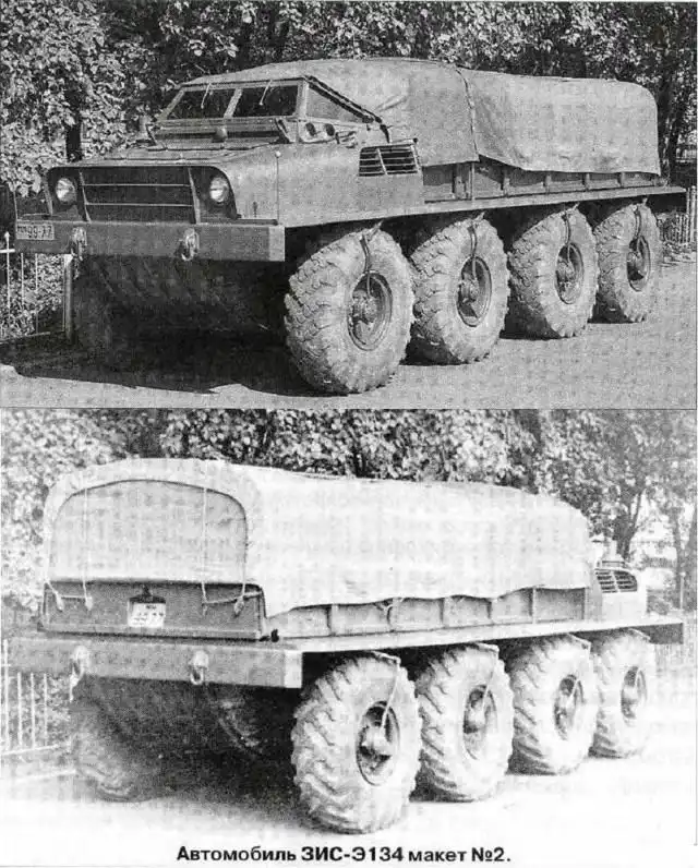 Поскольку опыта разработки таких машин не было, то для изучения вопросов повышения проходимости колесных автомобилей, а также для оценки влияния отдельных конструктивных параметров на проходимость в течение июля-августа 1955 г. был построен опытный четырехосный (8×8) грузовой автомобиль ЗИС-Э134 макет №1.