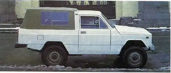 На первом варианте машины тент не имел боковых окон, однако при испытаниях стало ясно, что обзорности назад катастрофически не хватает и они были внесены в конструкцию. Однако герметичность кузова плохо влияла температурный режим работы «нивовских» агрегатов, в результате чего они быстро выходили из строя, легкий кузов не выдерживал серьезных нагрузок. Но прототип заказчикам все равно понравился, было решено продолжать работу и конструировать второй вариант джипа.