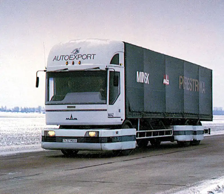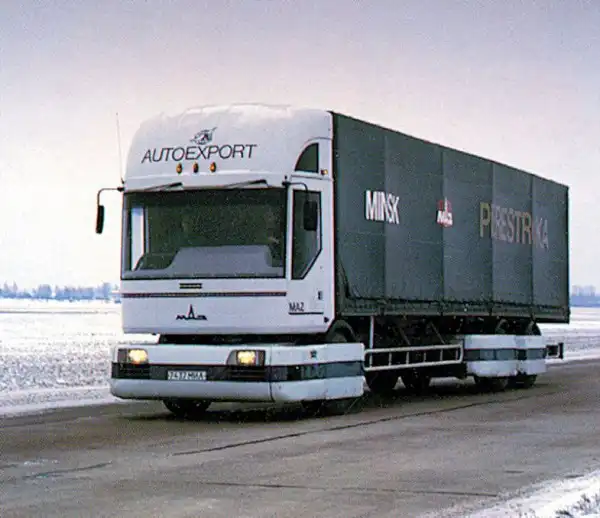 МАЗ 2000 «Перестройка» (1988) – прототип магистрального грузовика, отличавшийся оригинальной модульной конструкцией: спереди располагалась большая часть агрегатов – двигатель, коробка передач, ведущий мост и рулевое управление. При необходимости любая из «пассивных» тележек заменялась подобным набором агрегатов, позволяя строить автопоезда любой длины и грузоподъемности.