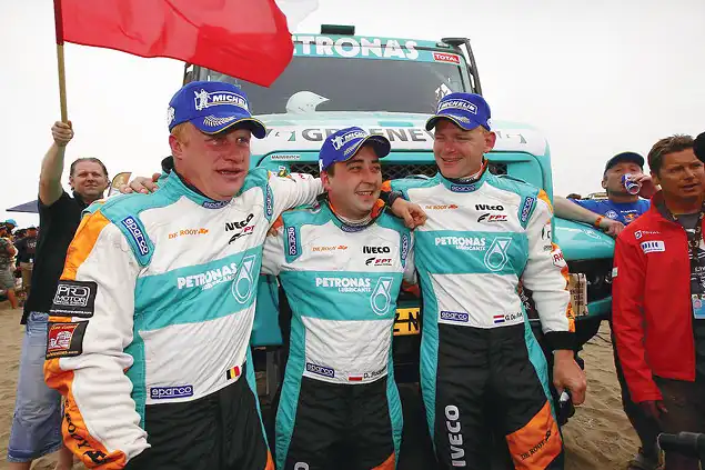 Победителем «Дакара» в грузовом зачете стал Жерар де Рой (справа) на IVECO, а следом за ним финишировал его напарник Ханс Стэйси. За исключением застрявшего на дюне Мики Биазона, пилоты голландской команды Team de Rooy избежали серьезных проблем и завоевали первое, второе, шестое и одиннадцатое места.
