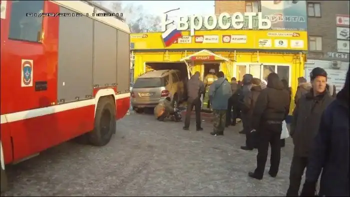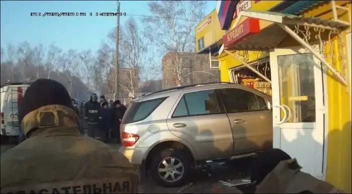 настырный клиент въехал в него на своем автомобиле, проломив стену :)