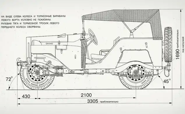Это, кстати, не давало никакого выигрыша в проходимости, а лишь усложнило разработку. Зато все плюсы «Бантама» и «Виллиса» также были унаследованы отечественной моделью: максимально упрощенный кузов без дверей, небольшая масса и отличная проходимость. Вместо шестицилиндрового мотора, который ставился на ГАЗ-61, «шестьдесят четвертый» получил четырехцилиндровый мотор мощностью 50 лошадиных сил. Но благодаря тому, что снаряженная масса составляла лишь 1200 килограммов, динамика машины была вполне приличной: ГАЗ-64 мог набирать 100 километров в час. Клиренс отечественного джипа — 21 сантиметр.