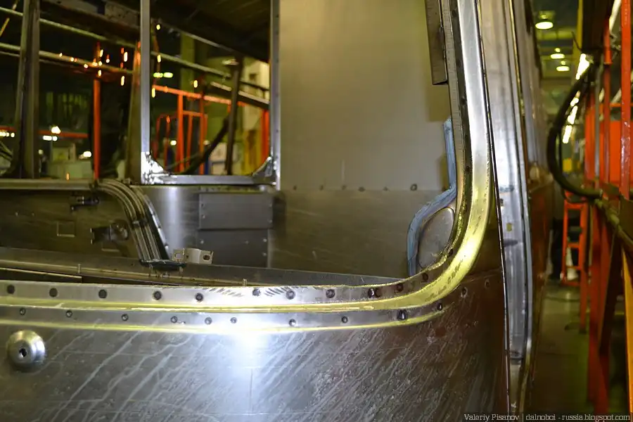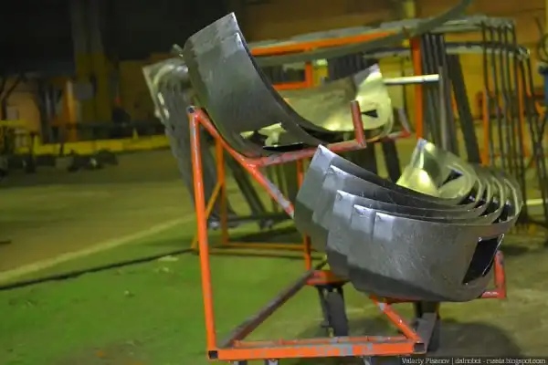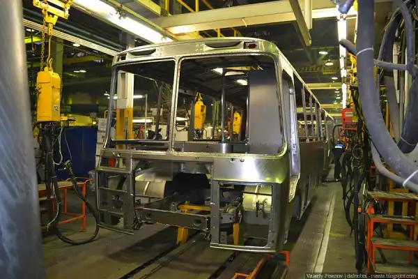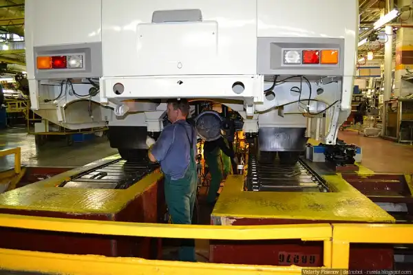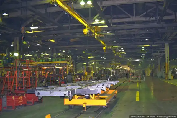 Каркас будущего автобуса начинает свой путь на конвейере.