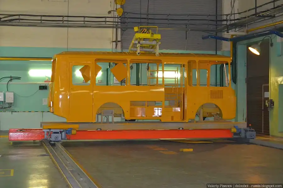 Свежеокрашенный автобус готов проследовать на сборочный конвейер.