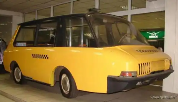 А это долго вынашиваемая идея городского такси дизайнера Юрия Аароновича Долматовского. Долгое время ничего не было известно и о судьбе самого прототипа: после того как о нем забыли, он попал в историческую экспозицию 19-го московского таксомоторного парка, где на него смотрели разве что передовики производства, делегации из других городов. Теперь он выставлен в музее. Его объемный стальной каркас облицован панелями из стеклопластика. В салоне четыре посадочных места. Вход и выход через одну боковую сдвижную дверь с правой стороны.