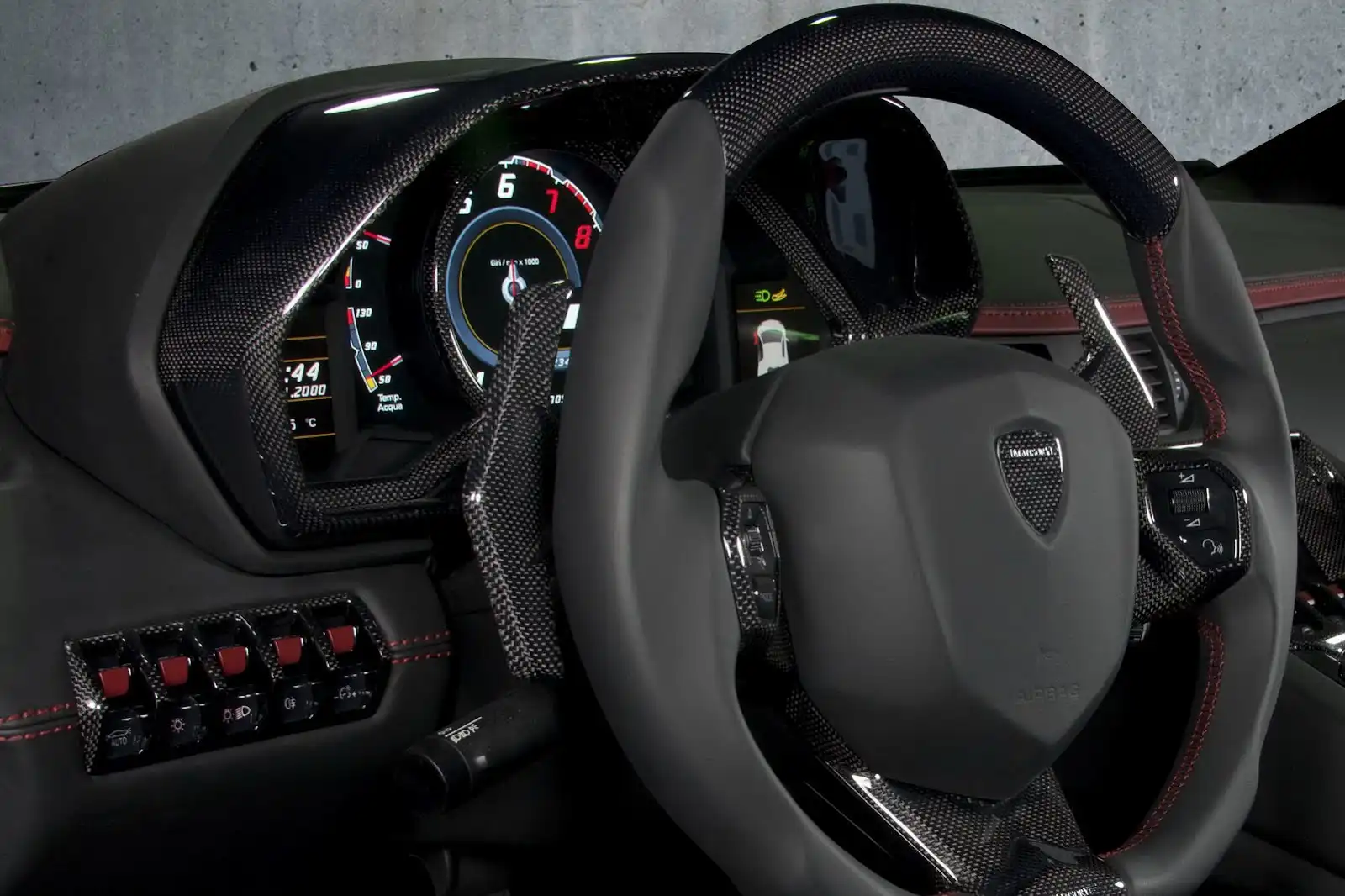 В салоне LP700-4 может похвастаться вставками из карбона, алюминиевыми педалями и кожаной обивкой, которой покрыты не только спортивные кресла, но и передняя панель.