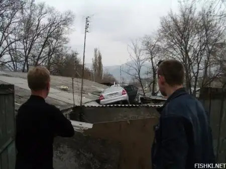 Как же так можно умудрится, что бы свой Мерс припарковать на крыше дома, дорога кстати не близко находится!