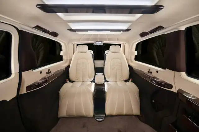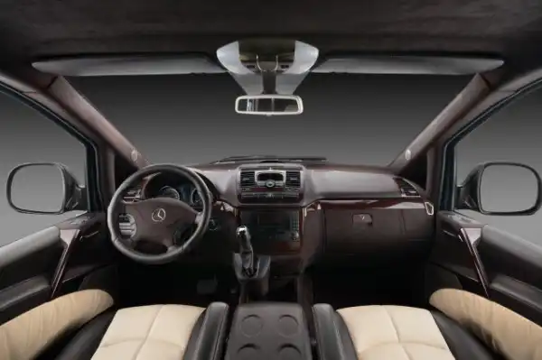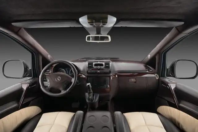 В интерьере Mercedes-Benz Vito изменений значительно больше. Среди материалов отделки преобладает натуральная кожа Nappa бежевого цвета, богатая Алькантара и живое натуральное дерево, которыми отделаны сиденья, подлокотники, потолок и передняя панель. Передние сиденья от купе CL-Class и четыре салонных места, представляют собой настоящие кресла, как в первом классе самолета. Удачное сочетание контрастных материалов и подсветки салона создают в салоне автомобиля ощущение уюта и умиротворения.