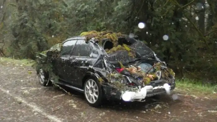 На лесную трассу прямо перед спортивным автомобилем Subaru WRX STi упало большое многолетнее дерево.