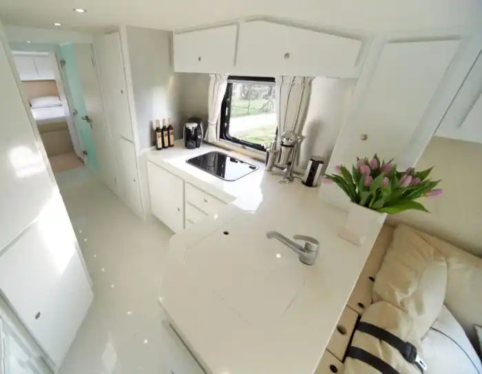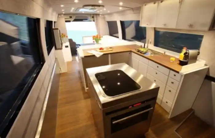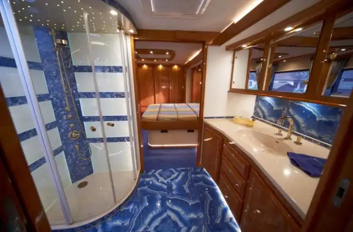 туалет и душ с горячей водой, а изюминкой этого кемпера является специальный встроенный "гараж",