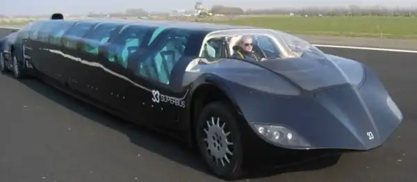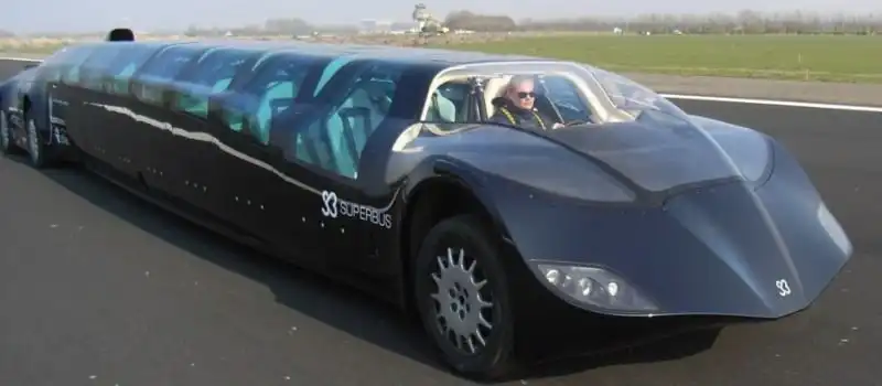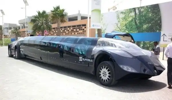 Этот шедевр автомобилестроения из Объединенных Арабских Эмиратов называют суперавтобусом, хотя внешне он больше напоминает спорткар. Это колесное чудо может вместить 23 пассажира и домчать их от Дубая до Абу-Даби всего за полчаса. Неудивительно, ведь он может развивать скорость до 250 км/ч. Длина суперавтобуса составляет 15 метров, ширина - 2,5 метра, а высота - 1,65 метра.