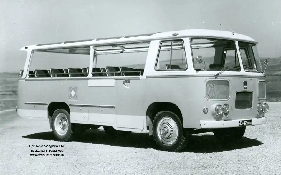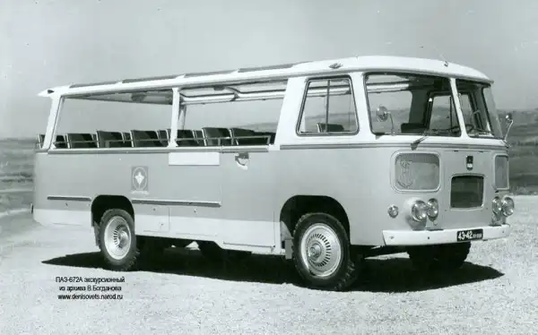 ПАЗ-672А - прогулочно-экскурсионный, с облегченной крышей и без бокового остекления.