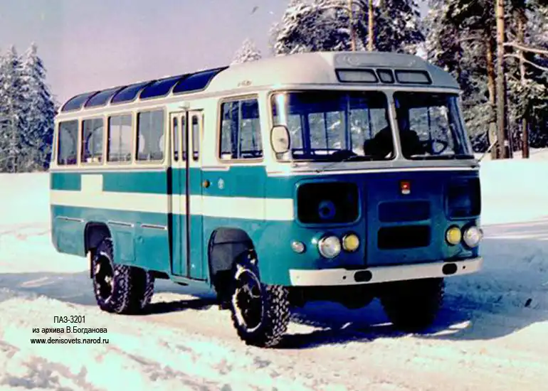 ПАЗ-3201 - полноприводный автобус. Не имел задней двери, за счёт чего количество сидячих мест было доведено до 26.