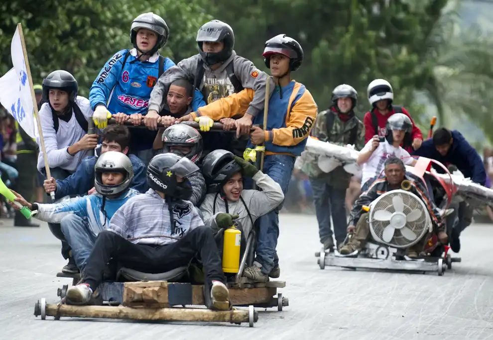 Люди спускаются вниз по холму на самодельных автомобилях во время Автофестиваля в Медельине, Колумбия.