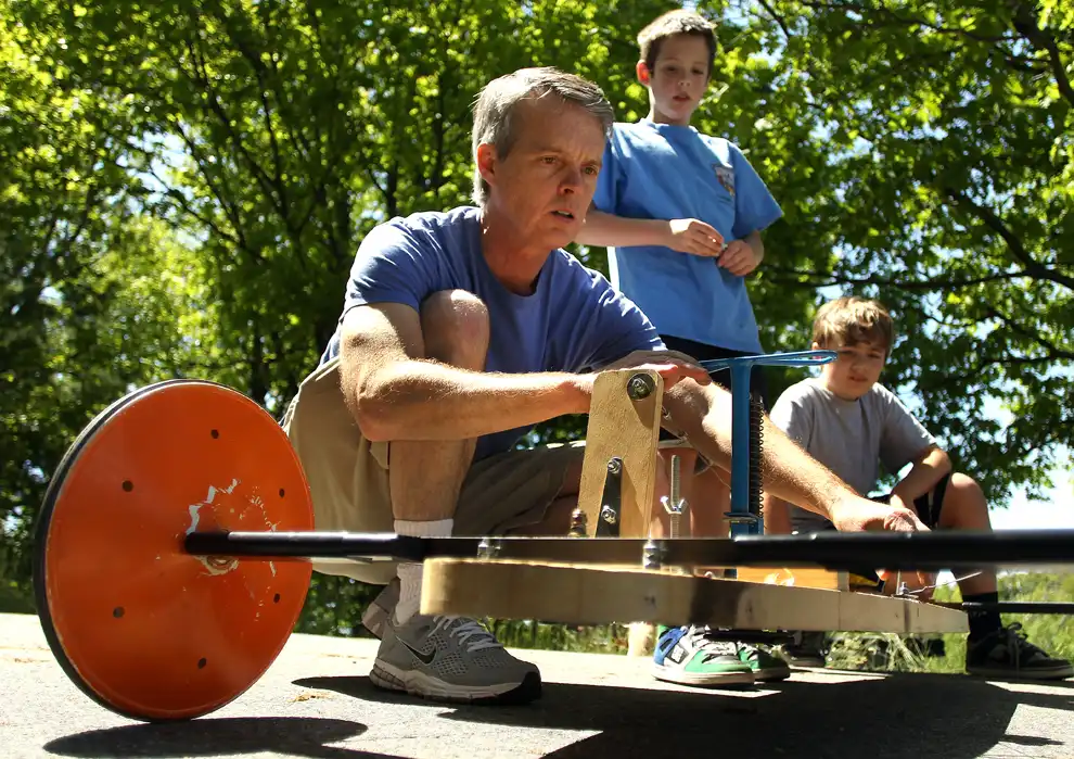 Кэри Конрад проверяет руль своего самодельного автомобиля в преддверии спуска по холму в Стоунхэме, штат Массачусетс.