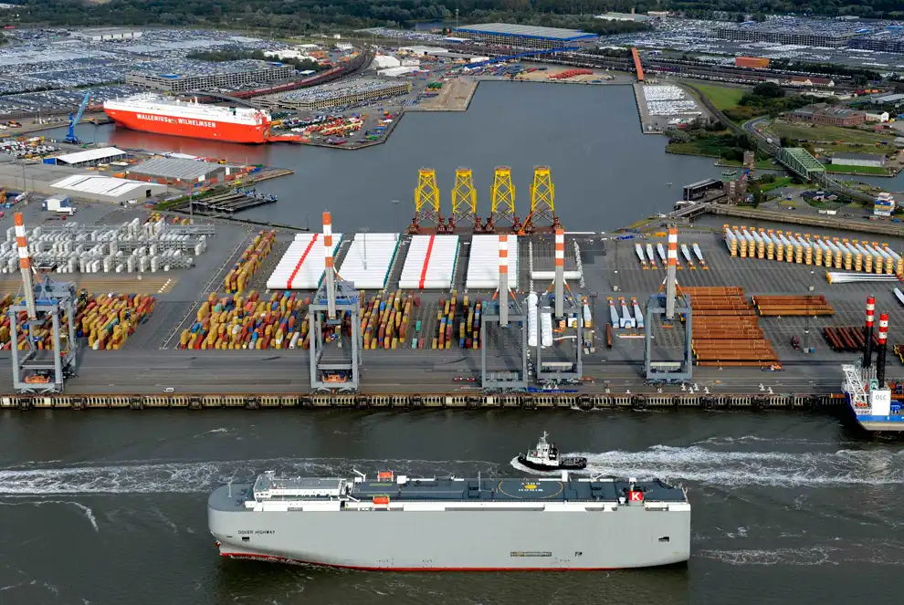 Судно с автомобилями на реке Эльба у грузового терминала гавани в Бремерхафене, Германия. Автомобили из Европы перевозят через Бремерхафен, где находится один из крупнейших в мире автомобильных портов.