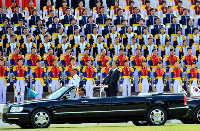 Президент Южной Кореи Ли Мён Бак (справа) и министр обороны Ким Кван-ин осматривают войска на церемонии в честь 64-летия южно-корейской армии в Керёне.