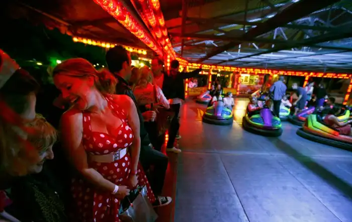 Подруга помогает Дженнифер Нопфель поправить платье на гонках, где Дженнифер вручает призы победителям.