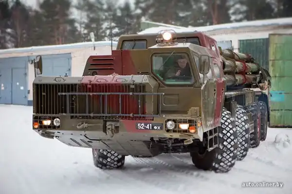 Полноприводной МАЗ-79111 с колесной формулой 8х8, разработанный белорусским автопромом, хорошо себя чувствует и на шоссе, и в условиях бездорожья. Оснащенный быстроходным дизельным мотором V12 с углом развала блока цилиндров 60° и мощностью в 650 «лошадей», он способен развивать скорость около 80 км/ч.