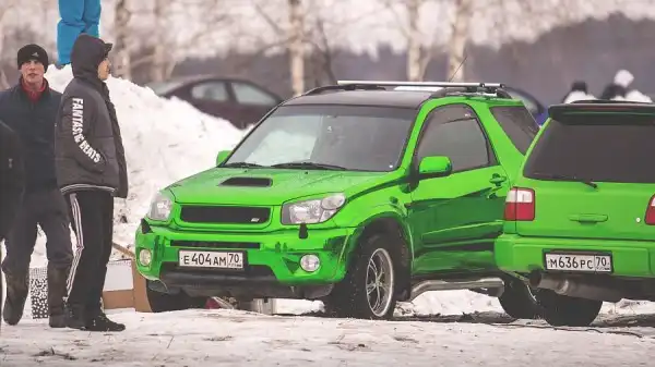 А это Toyota RAV4 Дениса Чумакова ака AutoDEN. Обклеен плёнкой в ... "ядаженезнаюкаксказать" зелёнохромированная плёнка? В общем зелёный хром! Всё с соблюдением фирменно цветовой гаммы. Как вы знаете Денис тоже плотно увлекается автоспортом, а именно Драг Рэйсингом, за спиной куча грамот, дипломов, кубков. Обо всём говорит опыт постройки очень мощных авто.