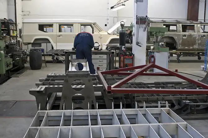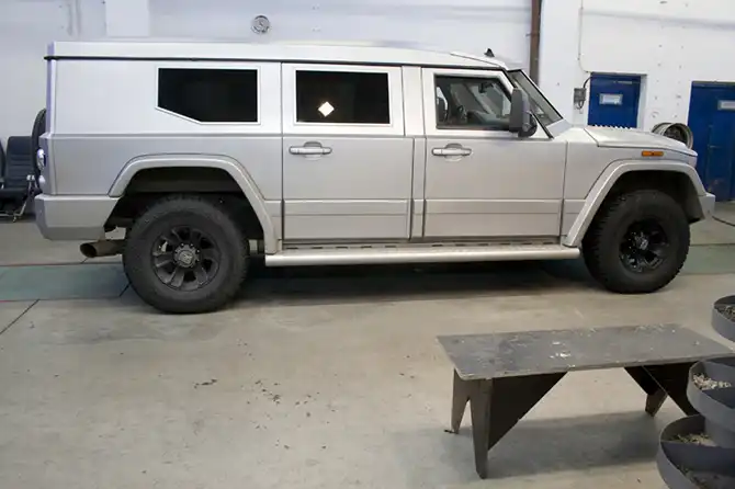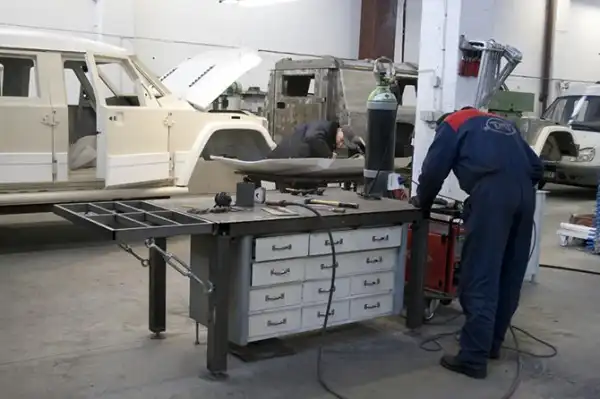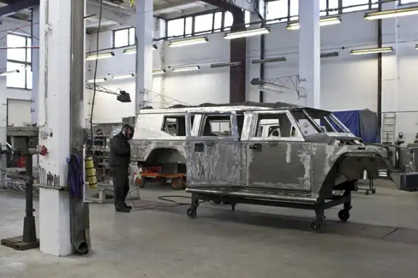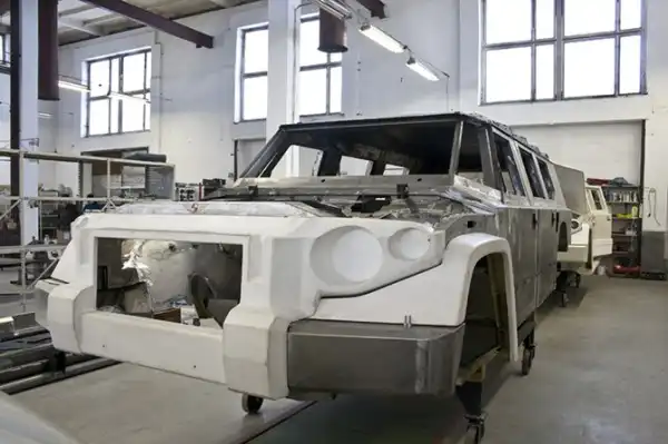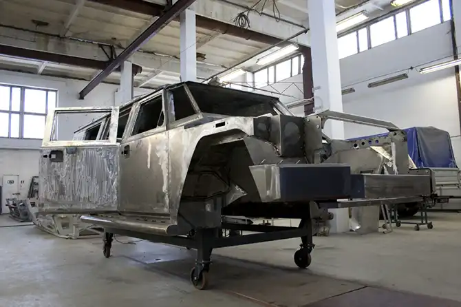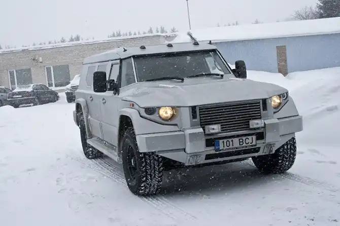 Строительство автомобиля начинается с пола. Днище машины имеет хитрую форму с энергопоглощающими скосами, защищающими от подрыва. Всего в кузове около 1000 крупных деталей, для более технологичной сборки используется высокоточная лазерная резка. На двух стапелях работают 18 человек, абсолютно все работы, будь то обшивка салона, покраска кузова или сварка брони, производят в Эстонии.