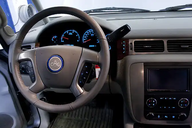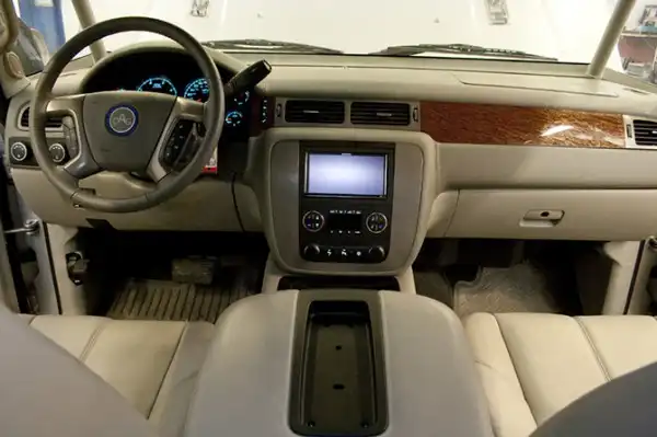 Если каждый день по нескольку раз открывать-закрывать тяжеленную водительскую дверь, можно мышцы накачать. В салоне уютно, по-американски просторно и приятно пахнет кожей (не китовой). Вот только обзор — весьма специфический, как из фешенебельного блиндажа. Переводим рычаг коробки в реверс и наблюдаем на экране в салоне картинку с камеры заднего вида. Настало время проверить невероятный броневик в действии.