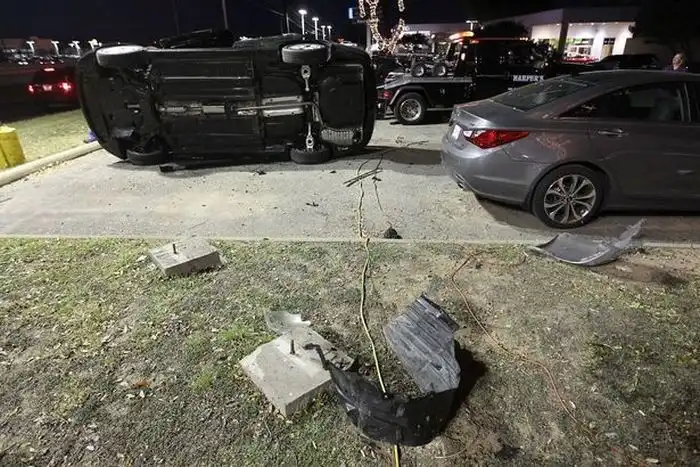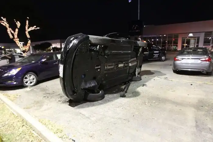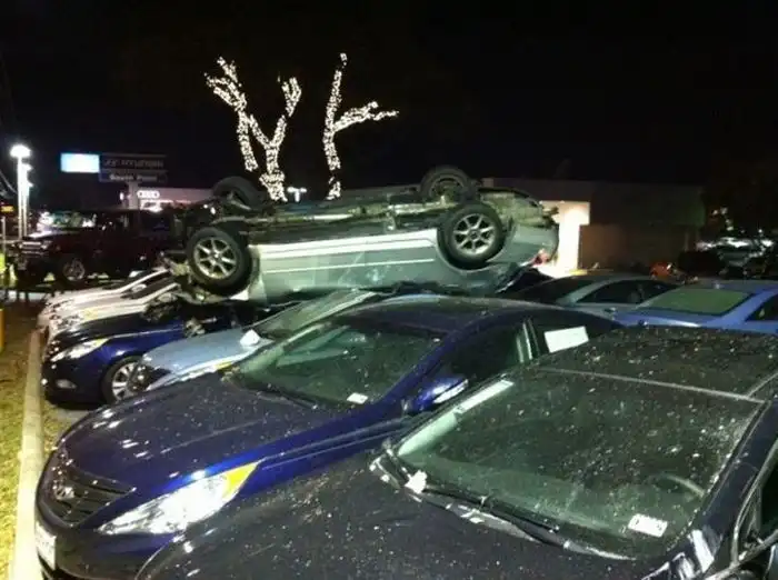 На парковке, где обычно выставлены новые автомобили на продажу, стояли опрокинутые