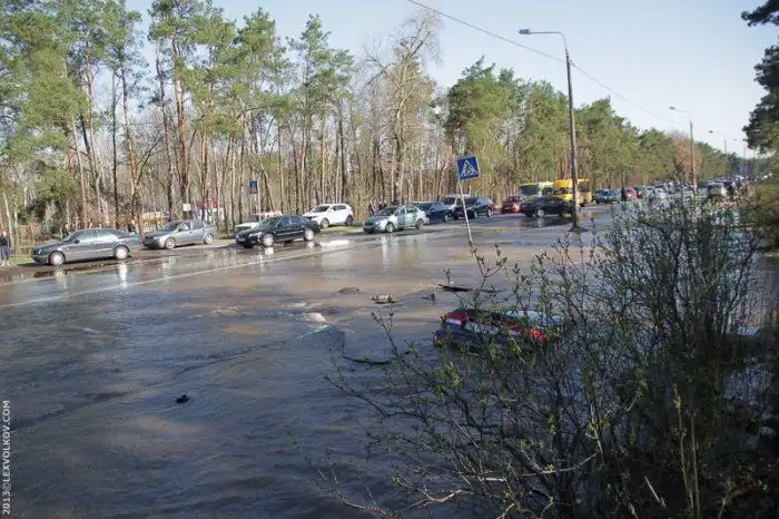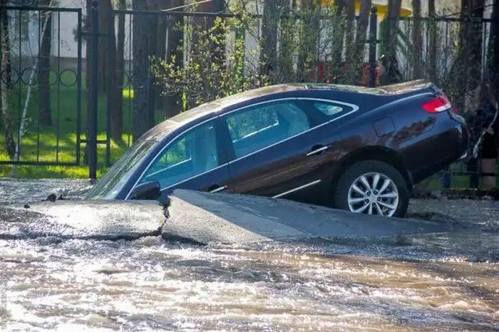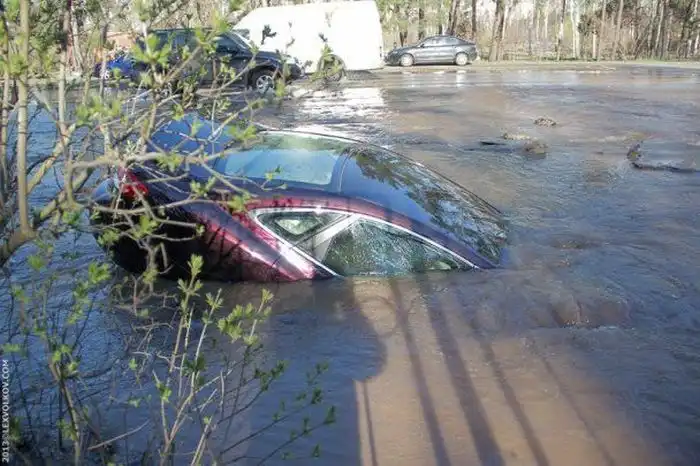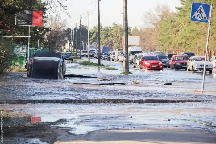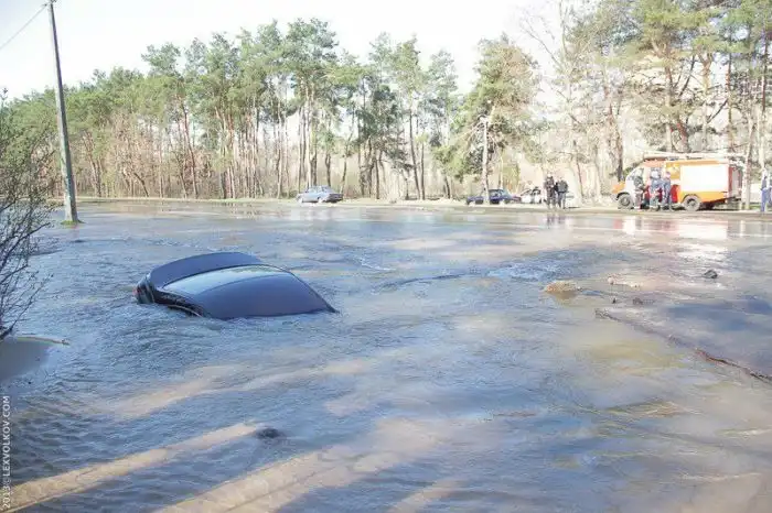 В этом году весна в Киев пришла довольно поздно, и от большого количества снега образовалось много талой воды. Но все это еще цветочки по сравнению с тем, сколько воды оказалось на улице Жмаченко в результате прорыва трубы. Собственно, воды разлилось столько, что прямо на улице затонул автомобиль! Ямка, в которую нырнуло авто, имеет размеры 3 на 4 метра, и в глубину, не много не мало, 2 метра. Автомобиль ушел под воду почти полностью и достать его с помощью лебедки не удалось, для этого понадобится кран. Движение на дороге в результате происшествия ограничено.
