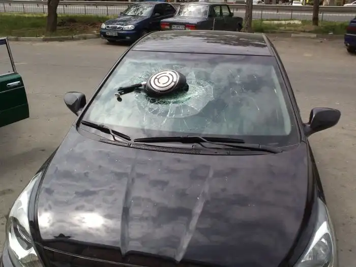 Данный случай произошел на Украине в городе Симферополе на ул. Киевской. Видимо, девушка была уж сильно чем-то недовольна и решила разбить лобовое стекло своего мужа необычным способом... :)