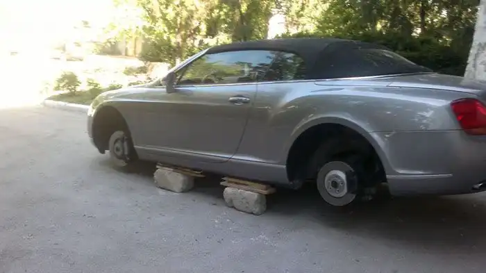 Одним из самых неприятных сюрпризов для любого автолюбителя, наверное, является кража колес... Но, как оказалось, когда у вас эксклюзивный или довольно редкий автомобиль, как этот Bentley Continental GT Convertible, не стоит сильно отчаиваться из-за кражи вашего дорогого комплекта колес. Почему? Смотрим далее ;)