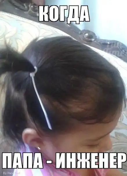 На фотке где у девочки волосы стяжкой (хомутом) стянуты, папа - монтер! Был бы инженер то он выдал бы маме письменные рекомендации за подписью бабушки как завязывать косичку!!!
