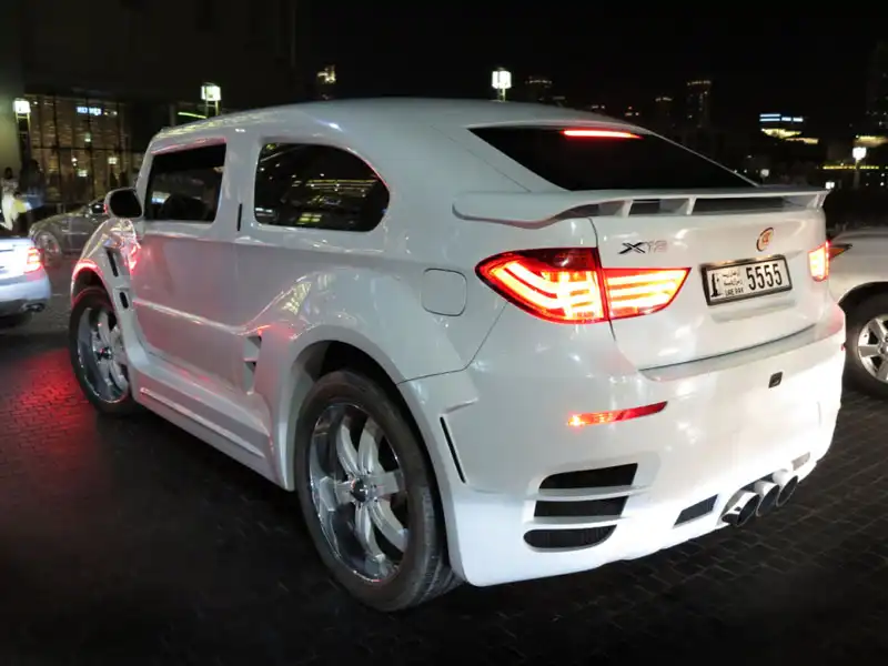 Судя по форме лобового стекла, донором для проекта послужил Hummer H3, однако никаких внешних панелей от него не осталось. Экстерьер внедорожника представляет собой адскую смесь запчастей разных производителей.Фары — от BMW седьмой серии, радиаторная решетка — от Lincoln, задняя часть вместе с фонарями и пятой (третьей в данном случае) дверью — от BMW X6.Капот с дефлекторами, антикрыло, широкие крылья с вертикальными гирляндами дневных огней, тройной выхлоп в центре заднего бампера — детали Hamann для Х6. Дверей оставлено только три, причем двери сделаны выпуклыми, как на том же BMW. Довершают облик арабского внедорожника колеса диаметром 26 дюймов.