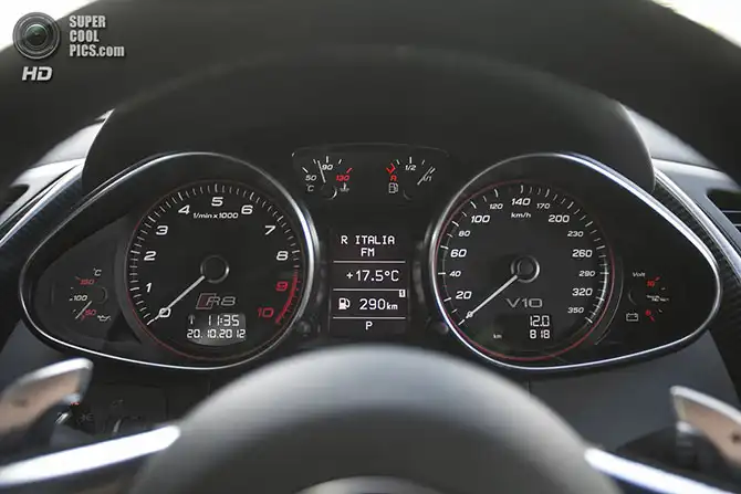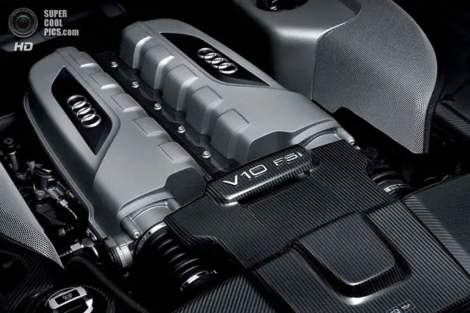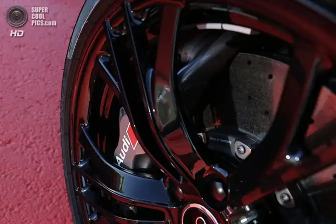 При взгляде спереди можно сразу представить, какая мощь скрыта под капотом Audi R8 V10 plus Coupé. Низкий передний спойлер, а также корпуса внешних зеркал заднего вида изготовлены из карбона. Устанавливаемые в стандартной комплектации керамические тормозные диски снижают массу автомобиля примерно на 12 кг по сравнению с деталями из стали. Снижение массы в сочетании с увеличением мощности, в конечном счете, означают одно — улучшение динамики. Впечатляющее значение удельного веса на единицу мощности — 3,95 кг/кВт — обещает невероятное удовольствие за рулём.