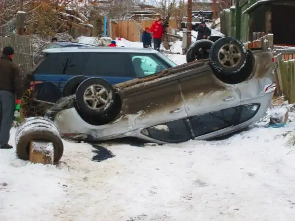 Hyundai видя такое дело предпочёл первенуться на крышу, предварительно заехав на земляной откос, а Land Rover не удержавшись врезался в него и развернулся: