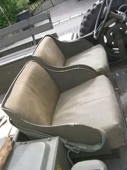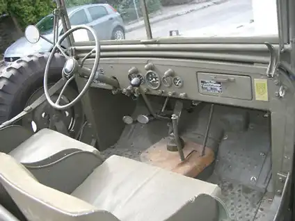 Приборы стандартны практически для всех американских военных автомобилей того времени. Руль - 3-х спицевый, удобный в обращении. Понижающей передачи нет, вместо этого используется первая передача. Виден рычаг выключения переднего моста и ручного тормоза.