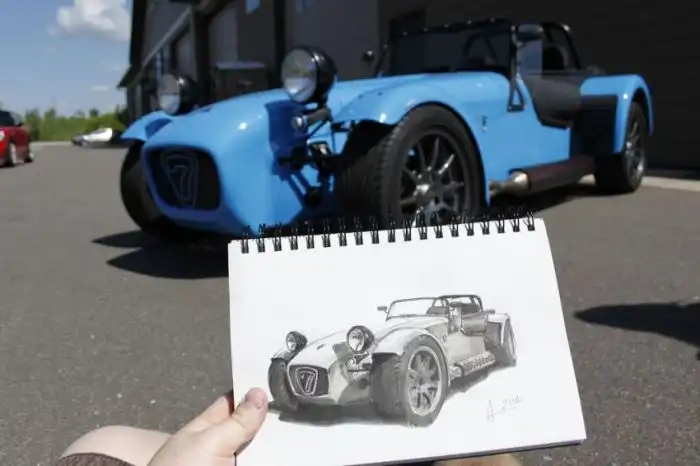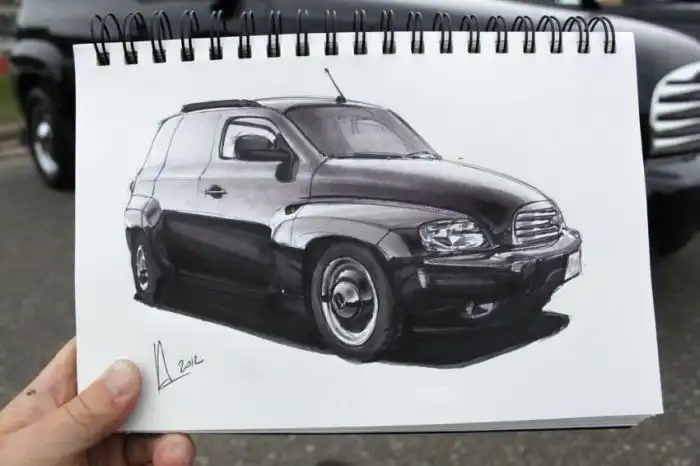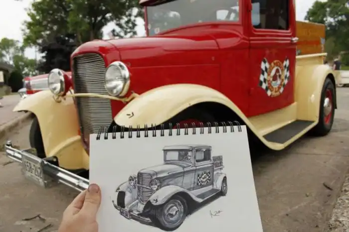 Художник Тайлер Линнер занимается тем, что сначала копирует автомобили на бумагу, а потом фотографирует своё творение на фоне этого же автомобиля.