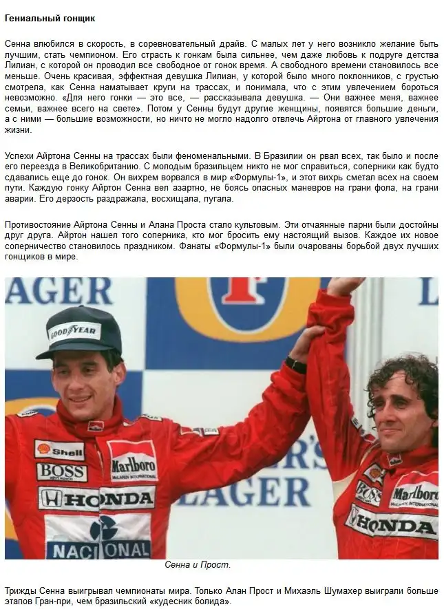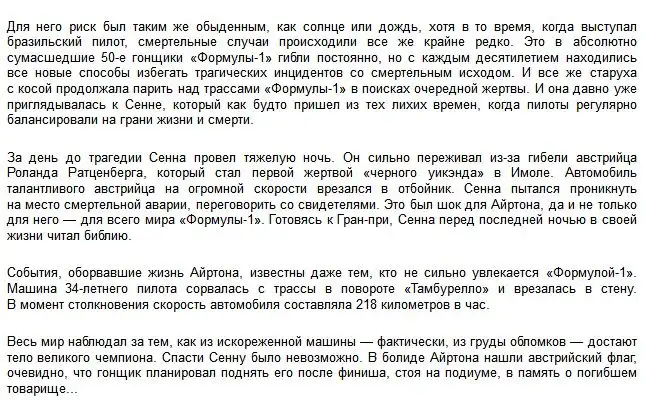 жаль нельзя тут видео кинуть, я бы показал от чего он погиб. Как истинный поклонник, скажу что вина в слишком низком клиренсе. Перед поворотом, он черканулся об покрытие, подлетает вверх, теряет сцепление... и тут момент, не из за того что покрышки остыли, а из за того что прижимная сила резко упала, когда клиренс после чирка об асфальт сильно увеличился, из за этого сцепления не хватило и его вынесло с трассы где он погибает. Подробнее можно прочитать самостоятельно про ГРАУНДЭФФЕКТ, и вы поймете о чем я. И еще, даже сам михаель шумахер признал что сенна лучше его!