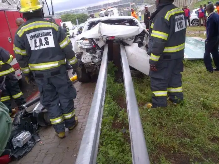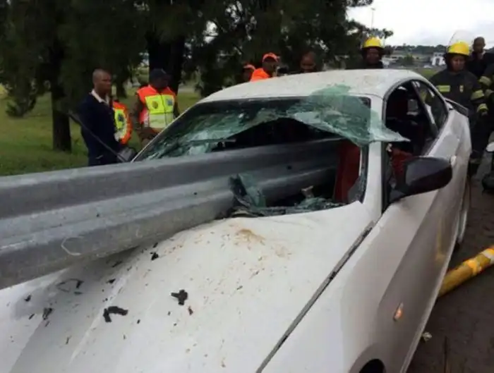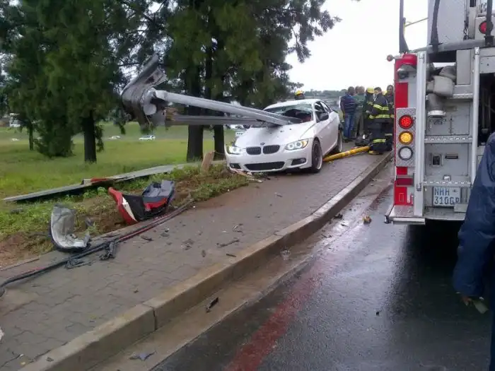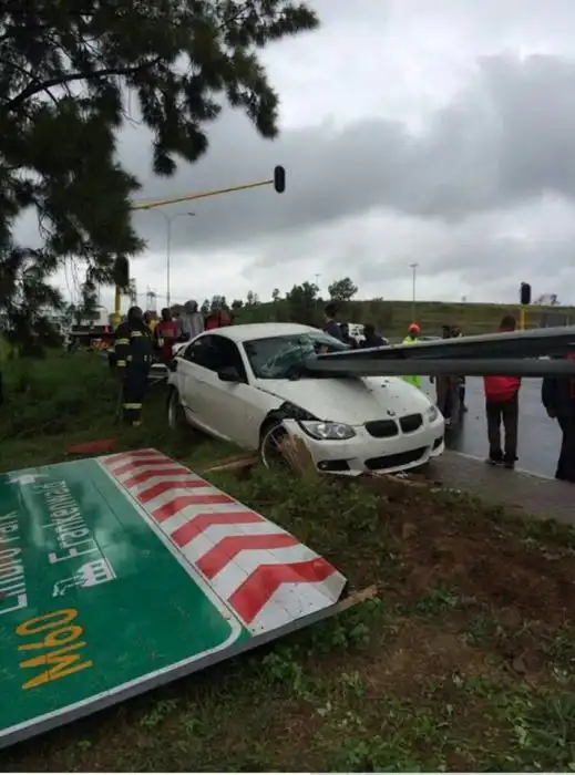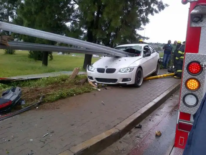 Эта жуткая авария произошла в Йоханнесбурге (ЮАР), а ее виновником стал защитник Футбольного клуба "Орландо Пайретс" Роой Махамутса. Футболист не справился с управлением своим BMW 335i с мощностью более 300 л.с. и в прямом смысле слова "насадил" свое авто на придорожный отбойник. Глядя на фотографии в продолжении поста даже и не верится, что кто-то мог бы выжить в таком ДТП, но к счастью, балка не задела футболиста, который отделался легким испугом и ссадинами.