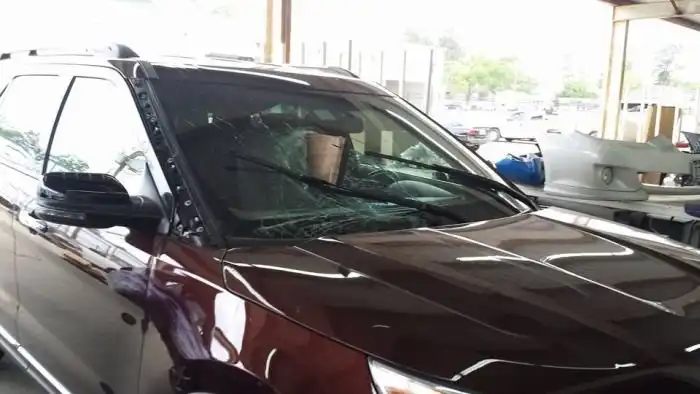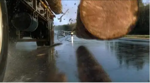 Владельца этого автомобиля можно назвать настоящим счастливчиком дня ;) Почему? Да все потому, что во время движения по трассе, ему чуть не оторвало голову доской, слетевшей с движущегося спереди грузовика. Настоящее везение в стиле кинофильма "Пункт назначения" :) Думаю, ему следовало бы в этот день купить лотерейный билет )