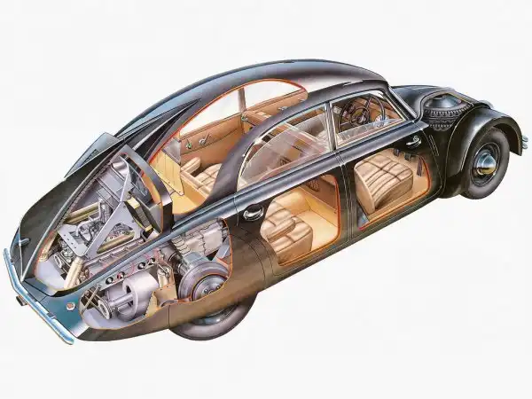 В 1947 в ассортименте появилась новая заднемоторная марка Tatra-107, более известная как Т-600 Tatraplan с 2-литровым 4-цилиндровым мотором.