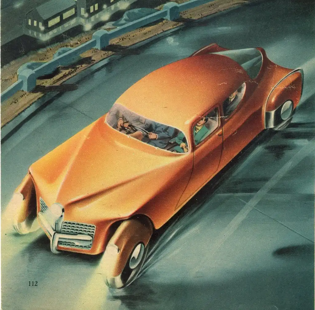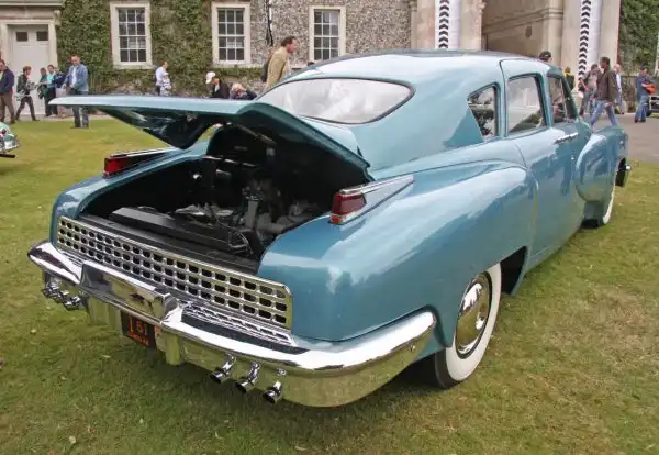 «Таккер Торпедо», который обеспечивал высокую безопасность пассажирам и развивал максимальную скорость более 200 км/ч. Он имел оригинальный кузов достаточно совершенной по тем временам аэродинамической формы с тремя передними фарами, оппозитный 6-цилиндровый двигатель рабочим объемом 9650 см3, располагавшийся в задней части кузова.Этот силовой агрегат был установлен наклонно сзади автомобиля, а рулевое колесо располагалось перед центральным сиденьем, состоявшим из трех раздельных кресел. Различные организационные трудности замедлили внедрение модели в производство.