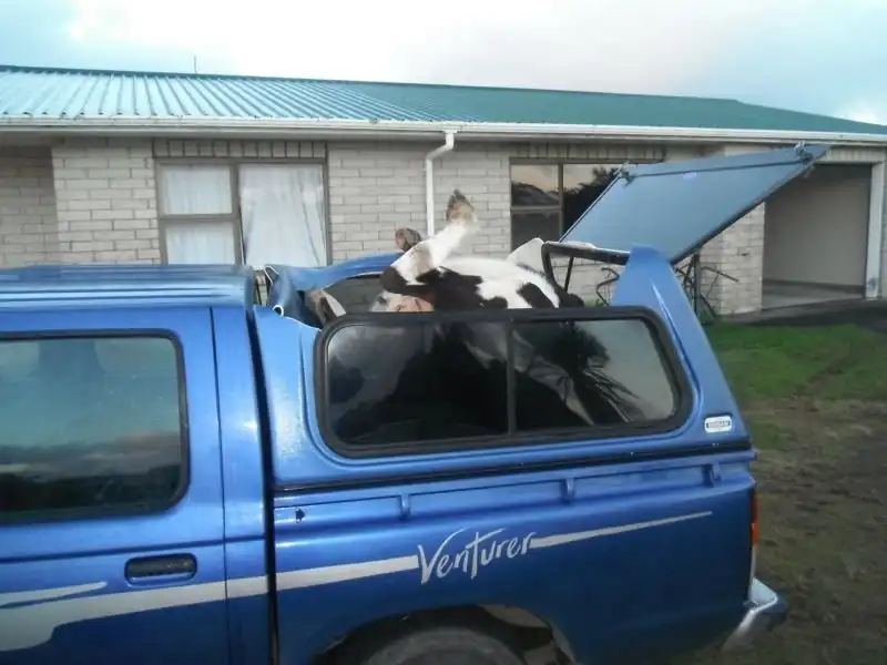 Кровавое ДТП с участием легковушки и крупного рогатого скота. Водитель на универсале влетел в корову на скорости более 100 км/ч, в результате чего животное взлетело в воздух и приземлилось прямо в багажнике. В общем, довольно технично - можно на шашлык домой вести.