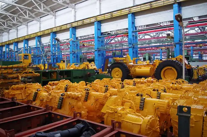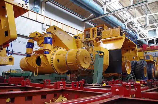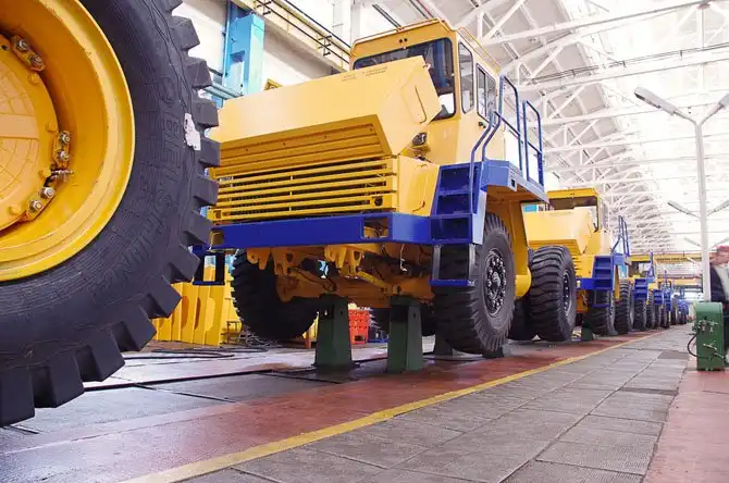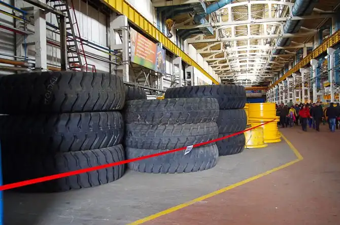 Здесь для доступа открыт главный конвейер и участок подготовки комплектующих. Первое, что можно увидеть при входе, это участок сборки колёс. Они последними устанавливаются на собранный самосвал. Вообще всё, что по прямой на этом снимке, это подготовка к производству. Сборка систем централизованной смазки, систем пожаротушения, сборка дизель-генераторов и мотор-колёс. После всё это передаётся на главный конвейер, который находится справа и устанавливается на собираемые самосвалы.