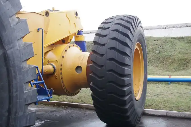 На осях используются спаренные колёса лишь потому, что на данный момент нету шин, которые могли бы осилить вес более 100 тонн. Сама покрышка высотой около 4х метров весит 5 тонн. В мире сейчас всего два завода, производящих покрышки такого размера – Мишлен и Бриджстоун. Впрочем Белшина обещает их догнать к 2015 году. Чтобы самосвал мог вписывался в радиус поворота 20 метров, обе оси сделаны поворотными.