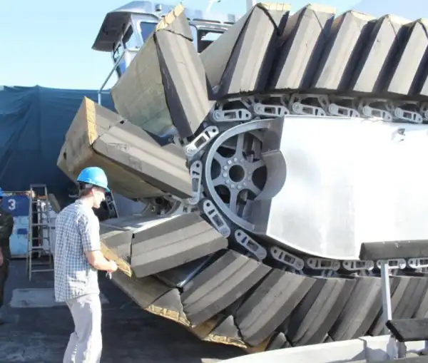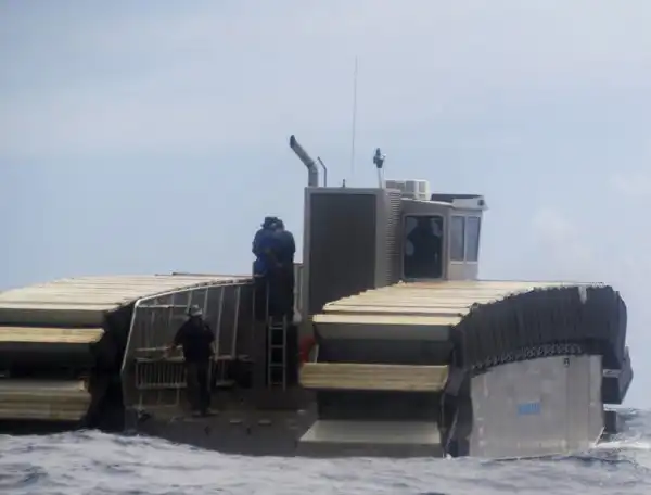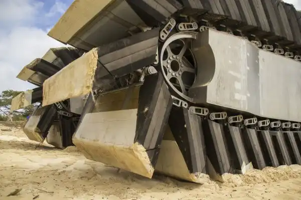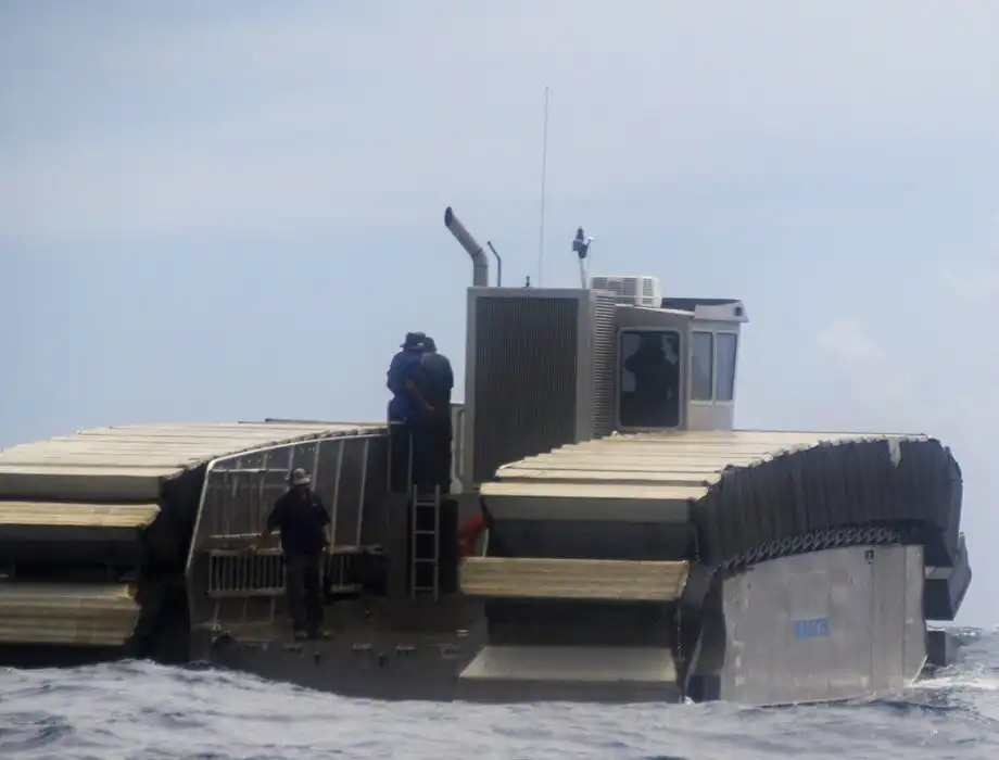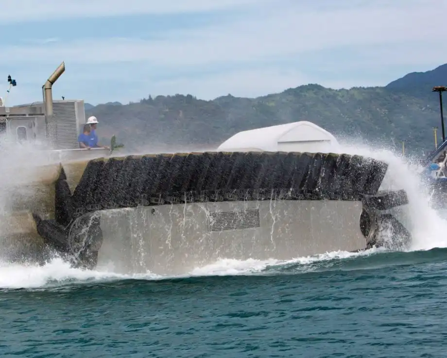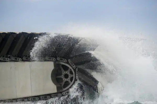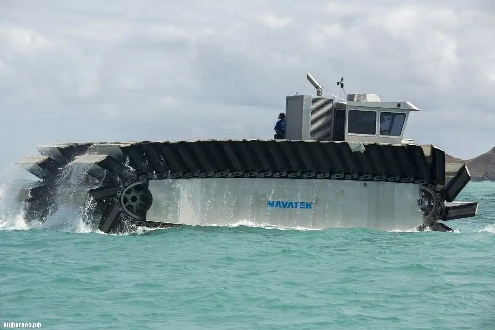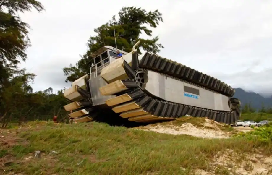 Десантное судно-амфибия UHAC использует не воздушную подушку, а специальные гусеничные траки из застывшей пены, накаченные воздухом. Данное решение позволяет амфибии легко перемещаться даже по самой труднопроходимой местности и десантироваться практически на любые участки побережья. UHAC без проблем преодолевает участки с илистым грунтом или болота. Большая площадь полых внутри гусениц-понтонов позволяет десантной амфибии равномерно распределять свой вес по поверхности, минимизируя давление на грунт, которое составляет всего около 70 грамм на 1 квадратный сантиметр. Благодаря этому транспортер легко преодолевает заболоченные участки дна, открывшиеся после отлива, а также любые грязевые «ванны» на своем пути.