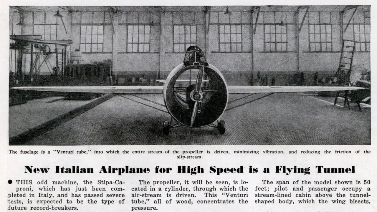 В 1940 г. Луиджи Стипа возродил идею французского конструктора Бертрана и убедил знаменитую фирму «Капрони» построить «туннельный» самолет, получивший название «Стипа-Капрони». Эта концепция получила наименование «Ala a turbina». В качестве двигателя был использован Джипси III» мощностью 120 л.с. (88,2 кВт) фирмы «Де Хевиленд», который приводил один воздушный винт.