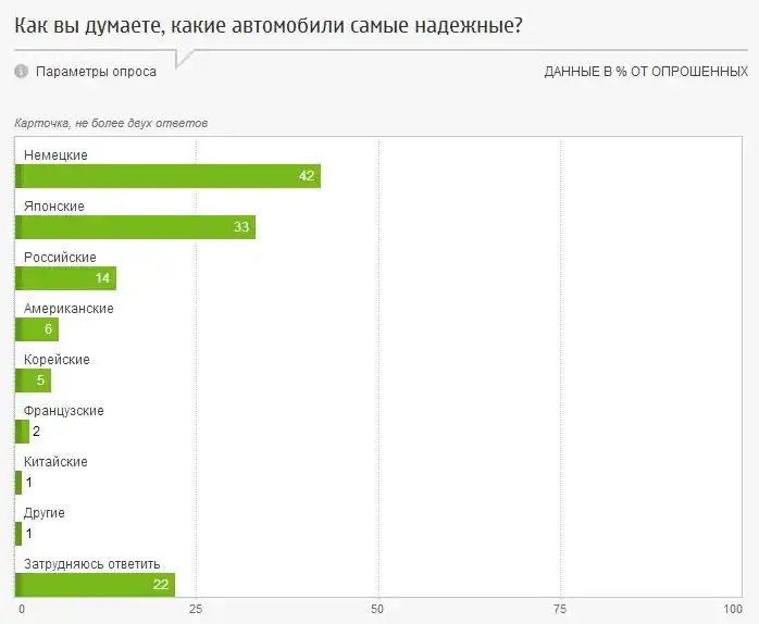 Второе место по каждой из указанных характеристик россияне отдали японским автомобилям. При этом российские автомобили заняли третье место по показателю «надежность», заработав 14% голосов опрошенных и обогнав американские (6%), корейские (5%) и французские (2%) автомобили. Также респонденты отметили низкие цены на российские автомобили — 52% респондентов сочли отечественные машины самыми доступными. На втором месте по этому параметру оказались китайские автомобили (за них высказалось 17% опрошенных), а на третьем — корейские (11%).