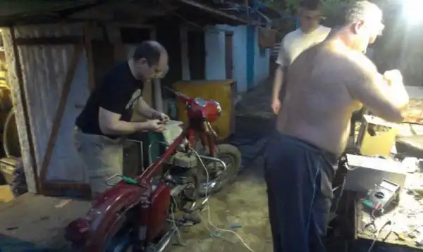 За эти два дня узнал, что рядом со мной живет бывший владелец мотоциклов Ява, вечером собрался консилиум, и мы решили завести это чудо Чешского мото-прома. Долго мы пытались его завести, разобрались во всей электрической цепи, но не как не удавалось… решили выпить чаю и взглянуть на это всё со свежей головой. Приободрившись после чая, мы заново всё проверили, почистили свечи, выставили зажигание и начали дергать дрынь-палку (кикстартер), через пару минут Старушка дала первые вспышки… промучились мы ещё около часа, пар шел от голов участвующих, кто то стоял с многозначительным видом и размышлял о высоком, кто то пытался вычисли проблему, а кто-то дергал дрынь-палку, в конце концов она завелась, и проработала на холостых, пока не закончился бензин… в общем вечер прошел не зря и закончился на позитивной ноте работающего двигателя, счастливые и довольный мы разошлись.